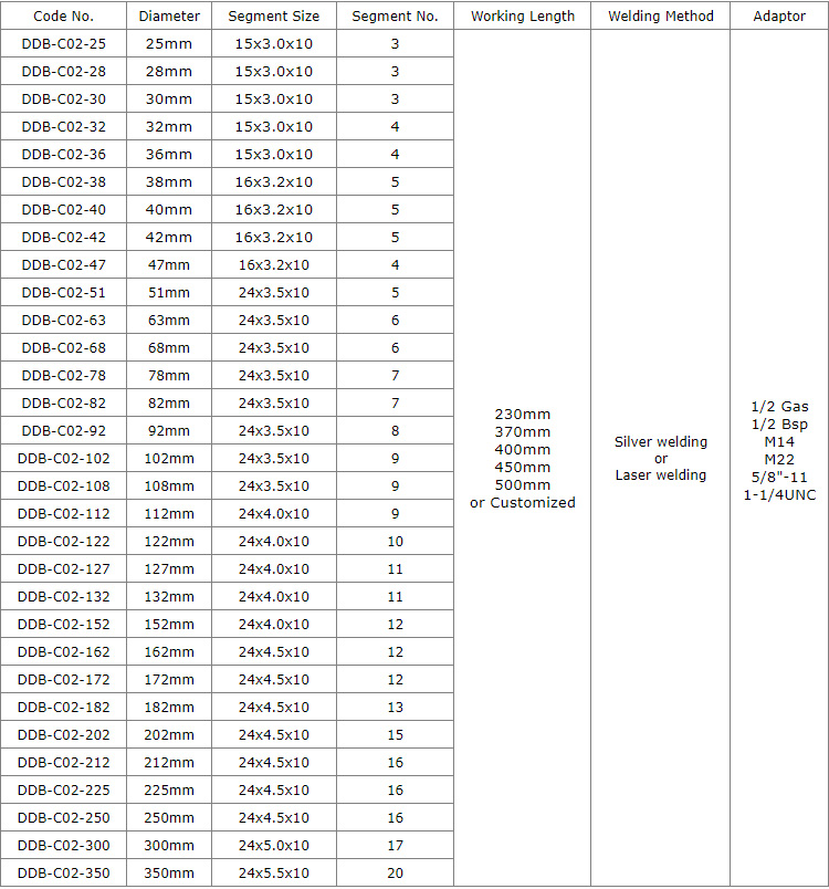 Diamond core drill bits with normal flat segments silver or laser welded diameter 25mm-350mm provide smooth and fast drilling for various concrete of cured reinforced concrete with hard to soft aggregates, green concrete or abrasive materials, such as construction of bridges, high-rise buildings, wall, floor, etc., which have goods quantity of drilling holes, high performance in drilling difficult operation conditions, especially reinforced concrete with much steel bars or pebble stone.