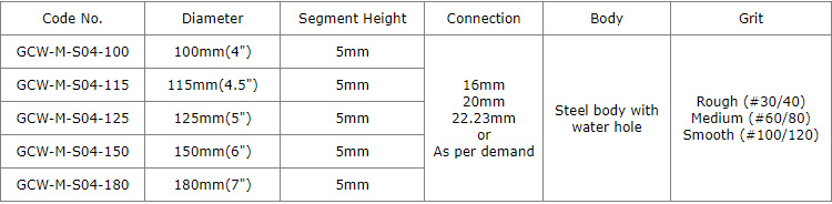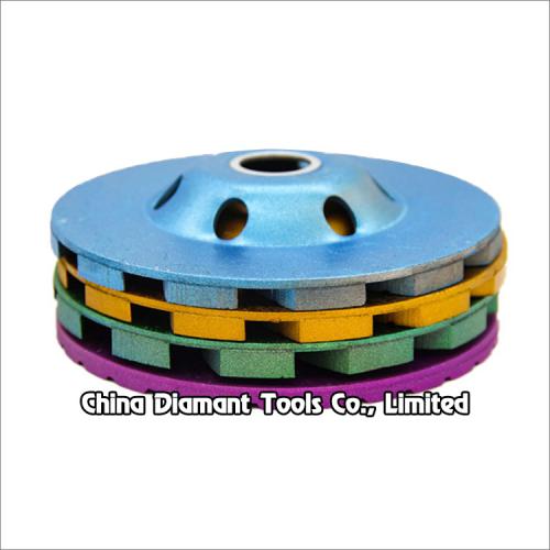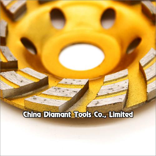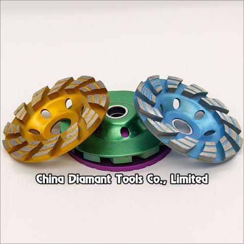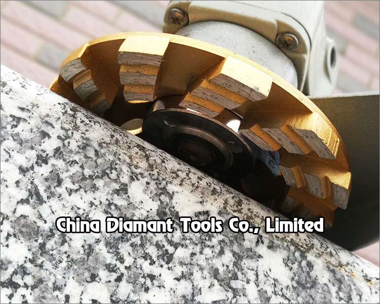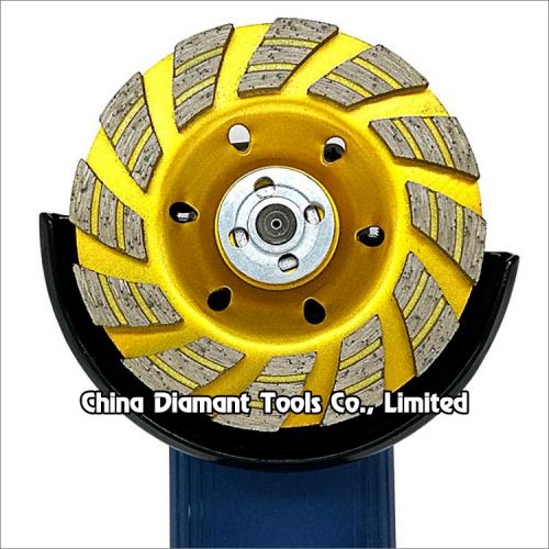This diamond grinding cup wheels with turbo grooved segments generally applicable to the grinding of various stone, marble, granite, ceramic, tile, artificial stone, etc., especially suitable for the building decorated with concrete wall, marble floor, grinding edge of granite plate, chamfering and arc grinding, ideal for smoothing and shaping as well as stock removal.