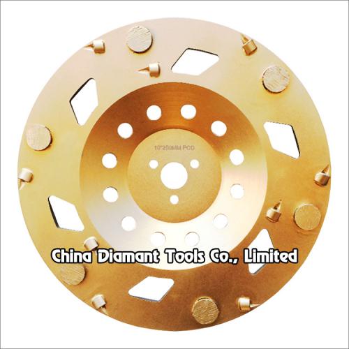 PCD grinding cup wheel with 1/4 PCD & round diamond segments is a perfect tool which is used on floor grinders for sharp removal of heavy epoxy, coatings, mastic, glues or even fast stock removal of concrete, which is designed for fast removing hard and tacky surfaces including: waterproofing membrane, pool deck coating, thick mastic, old and new epoxy coating, paint, VCT/carpet glues, etc.