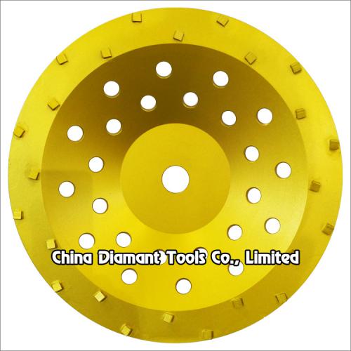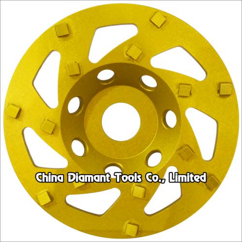 PCD cup wheel is a perfect tool for sharp removal of heavy epoxy, coatings, mastic, glues or even fast stock removal of concrete, which is designed for fast removing hard and tacky surfaces including: waterproofing membrane, pool deck coating, thick mastic, old and new epoxy coating, paint, VCT/carpet glues, etc., usually the PCD segment scrapes and rips the toughest coating from the surface quickly and effectively with no loading up.