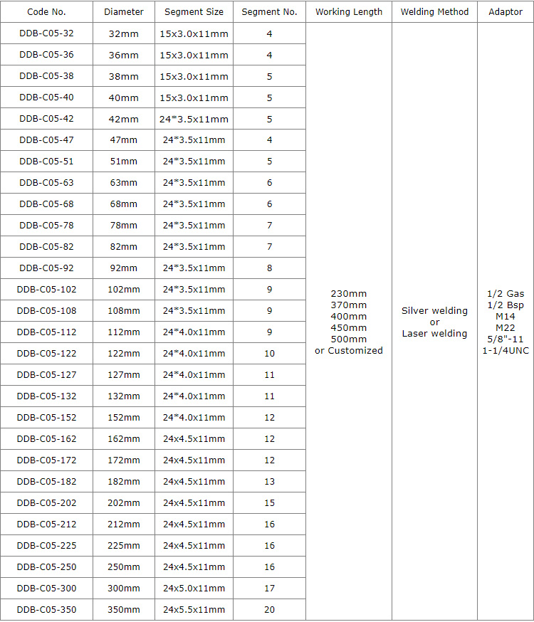Cuspate top is benefit for segment opening and fast initial drilling.