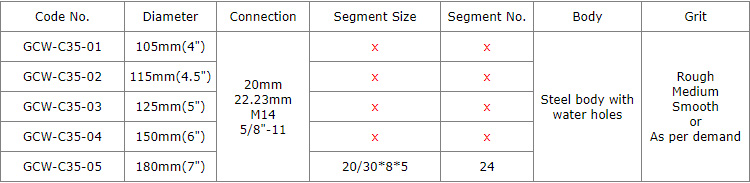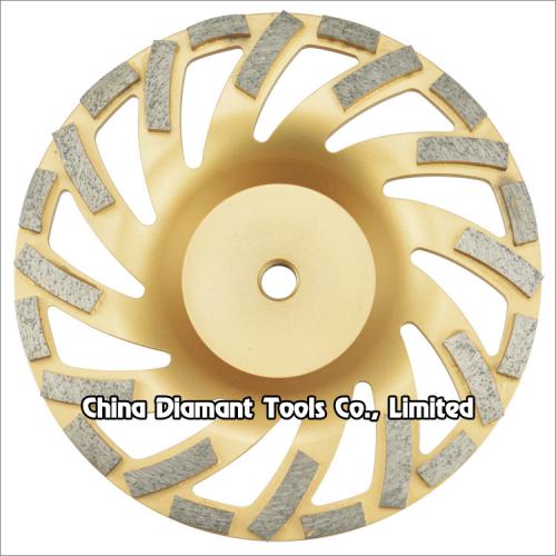 Diamond grinding cup wheels with turbo & ring rows segments for grinding various concrete or other masonry materials such as stone, terrazzo, bricks, etc., ideal for smoothing and shaping as well as stock removal.