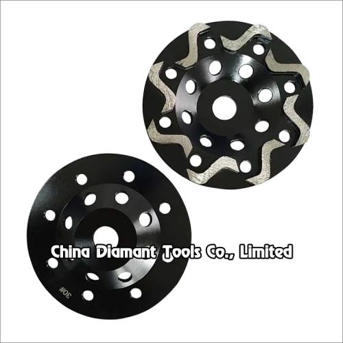 Diamond grinding cup wheels with S shape segments for grinding various concrete or other masonry materials such as stone, terrazzo, bricks, etc., ideal for smoothing and shaping as well as stock removal.
