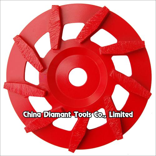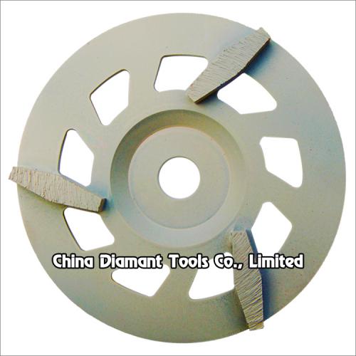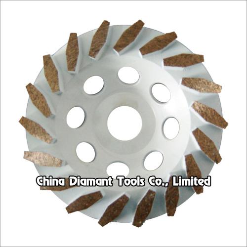 Diamond grinding cup wheels with big prismatic segments for grinding various concrete or other masonry materials such as stone, terrazzo, bricks, etc., ideal for smoothing and shaping as well as stock removal.