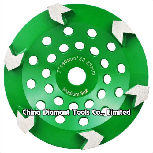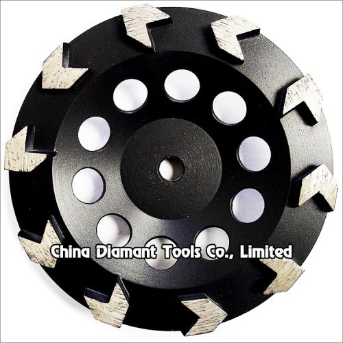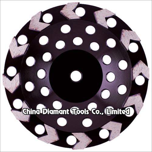Diamond grinding cup wheels with big arrow segments are brazed with a high diamond count for long life grinding various concrete or other masonry materials such as stone, terrazzo, bricks, etc., ideal for smoothing and shaping as well as stock removal.
