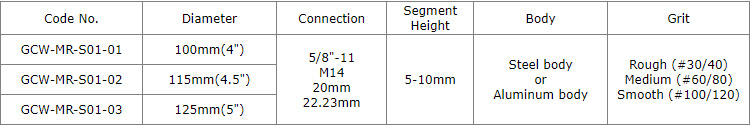 The hot-press sintered segments offers efficient and steady performance, #30 for the first step coarse grinding, #50/60 for the medium next step, #100/120 for fine grinding, Grit #100/120 diamond grits provide great finishing and much longer working life.