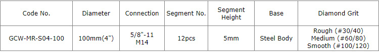 The hot-press sintered segments offers efficient and steady performance, #30 for the first step coarse grinding, #50/60 for the medium next step, #100/120 for fine grinding, Grit #100/120 diamond grits provide great finishing and much longer working life.