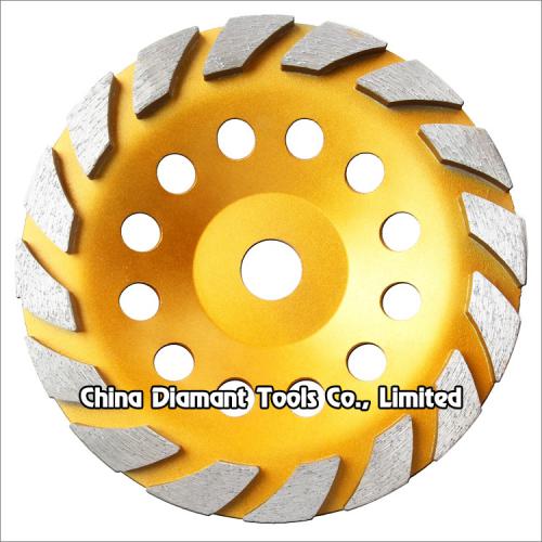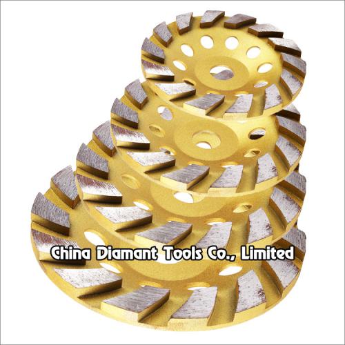 This diamond grinding cup wheels with turbo shape segments generally applicable to the grinding of various stone, marble, granite, ceramic, artificial stone, etc., especially suitable for the building decorated with concrete wall, marble floor, grinding edge of granite plate, chamfering and arc grinding, ideal for smoothing and shaping as well as stock removal.