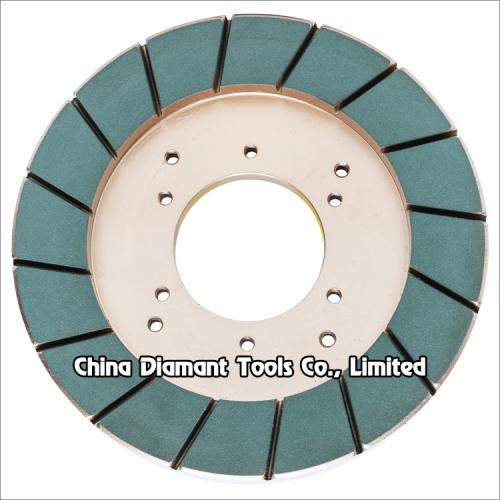 Diamond squaring wheels are used to make modifying the uprightness of ceramic tiles four edges in order to achieve scheduled size, it is a necessary squaring tool for big size glaze ceramic tiles, porcelain tiles and polished porcelain tiles. This segmented type resin bond squaring wheel is used after the metal bond diamond squaring wheel, on continuous automatic polishing line for making fine squaring on ceramic tiles edges in order to achieve high precision size, flat and smooth effect.