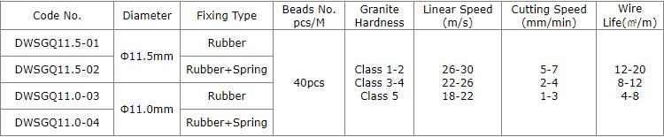 For granite quarry, the cables are in general fitting by injection of vulcanized rubber, the advantage is better adheres to the beads and support cable, which protect it better from the action of abrasive pastes. The rubber wire easily withstands increases in temperature caused by badly controlled water spraying is power 11-75KW. The water spraying between 25-50 L/min according to the cut dimension.