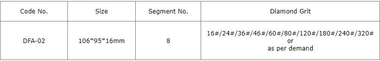 Metal bond diamond Frankfurt abrasive with bar segments is usually used for rough calibration and medium grinding on granite natural stone and artificial quartz slabs with automatic polishing machines and line polishing machines with the characteristics of stabilization, extremely high output, low consumption, excellent gloss etc.
