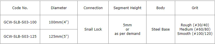 Diamond grinding wheels with turbo continuous rim segment and snail lock back for grinding slab edge of various stone such as granite marble, sandstone, limestone, etc..