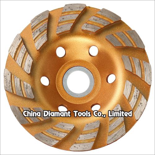 This diamond grinding cup wheels with turbo grooved segments generally applicable to the grinding of various stone, marble, granite, ceramic, tile, artificial stone, etc., especially suitable for the building decorated with concrete wall, marble floor, grinding edge of granite plate, chamfering and arc grinding, ideal for smoothing and shaping as well as stock removal.