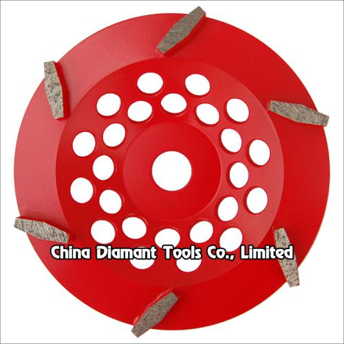 Diamond grinding cup wheels with big prismatic segments for grinding various concrete or other masonry materials such as stone, terrazzo, bricks, etc., ideal for smoothing and shaping as well as stock removal.