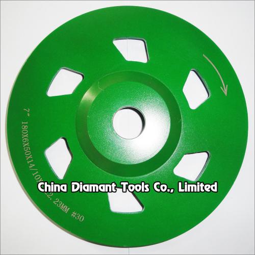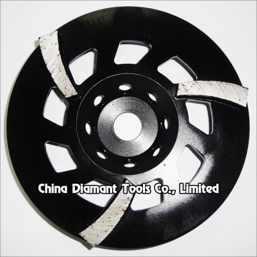 Diamond grinding cup wheels with big spiral segments for grinding various concrete or other masonry materials such as stone, terrazzo, bricks, etc., ideal for smoothing and shaping as well as stock removal.