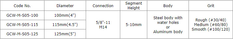 The hot-press sintered segments offers efficient and steady performance, #30 for the first step coarse grinding, #50/60 for the medium next step, #100/120 for fine grinding, Grit #100/120 diamond grits provide great finishing and much longer working life.
