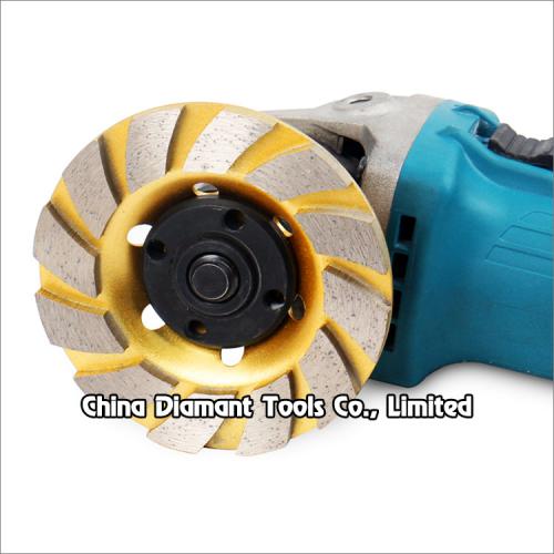 This diamond grinding cup wheels with turbo shape segments generally applicable to the grinding of various stone, marble, granite, ceramic, artificial stone, etc., especially suitable for the building decorated with concrete wall, marble floor, grinding edge of granite plate, chamfering and arc grinding, ideal for smoothing and shaping as well as stock removal.