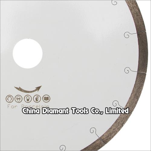 Diamond saw blades continuous rim with laser cut fishhook slot for cutting ceramic, porcelain, tile, masonry, marble, and soft stone, fast cutting speed with less chips.
