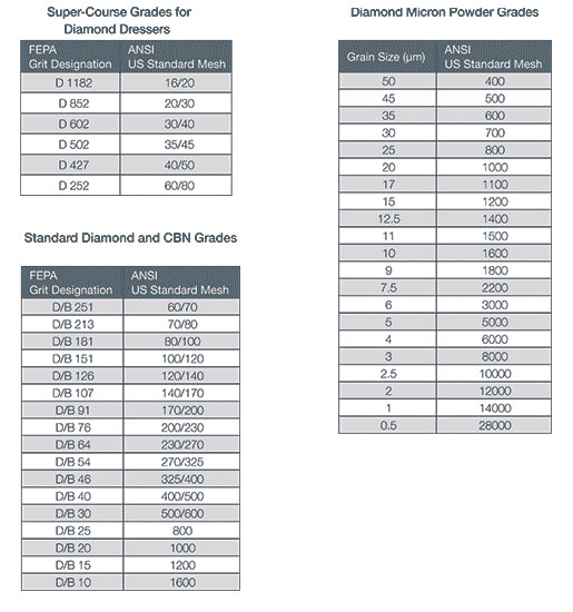 The grit designation is prefixed with a "D" to denote diamond and a "B" to denote CBN.